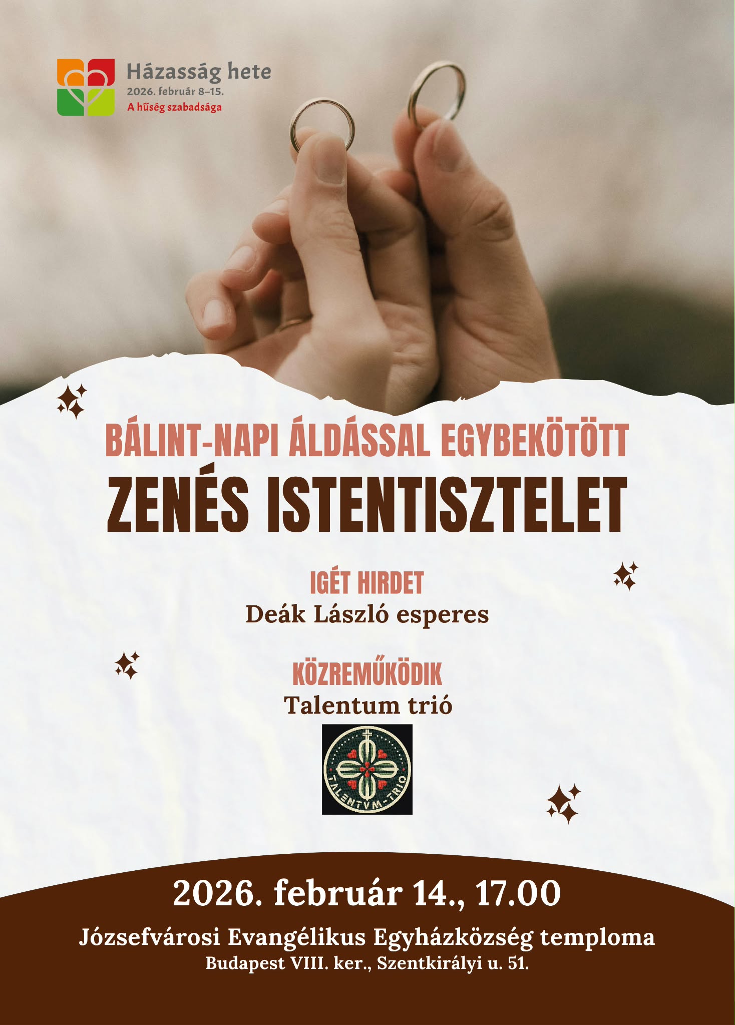 Igehirdetéssel szolgál: Deák László esperes, kispesti evangélikus lelkész Zenei szolgálat: Talentum Trio